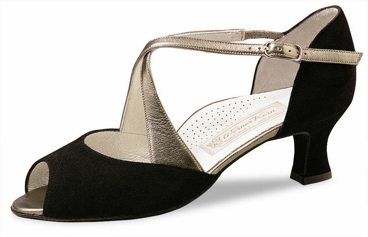 Elegantní bota Werner Kern v černé a antikové barvě. Malé otevření špičky zabraňuje sklouzávání chodidla. Perfektní uchycení je zajištěno nastavitelnými vnějšími řemínky a individuálně nastavitelnou kůží potaženou elastickou gumičkou na vnitřní straně.
