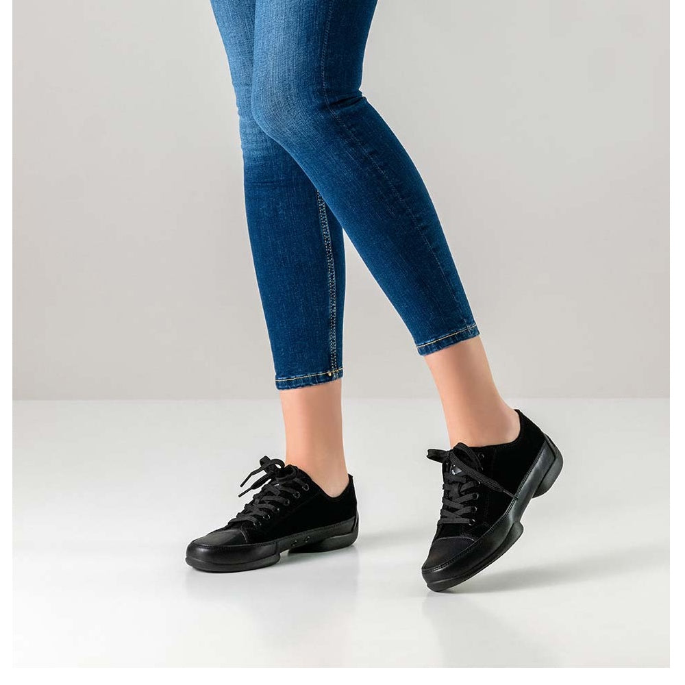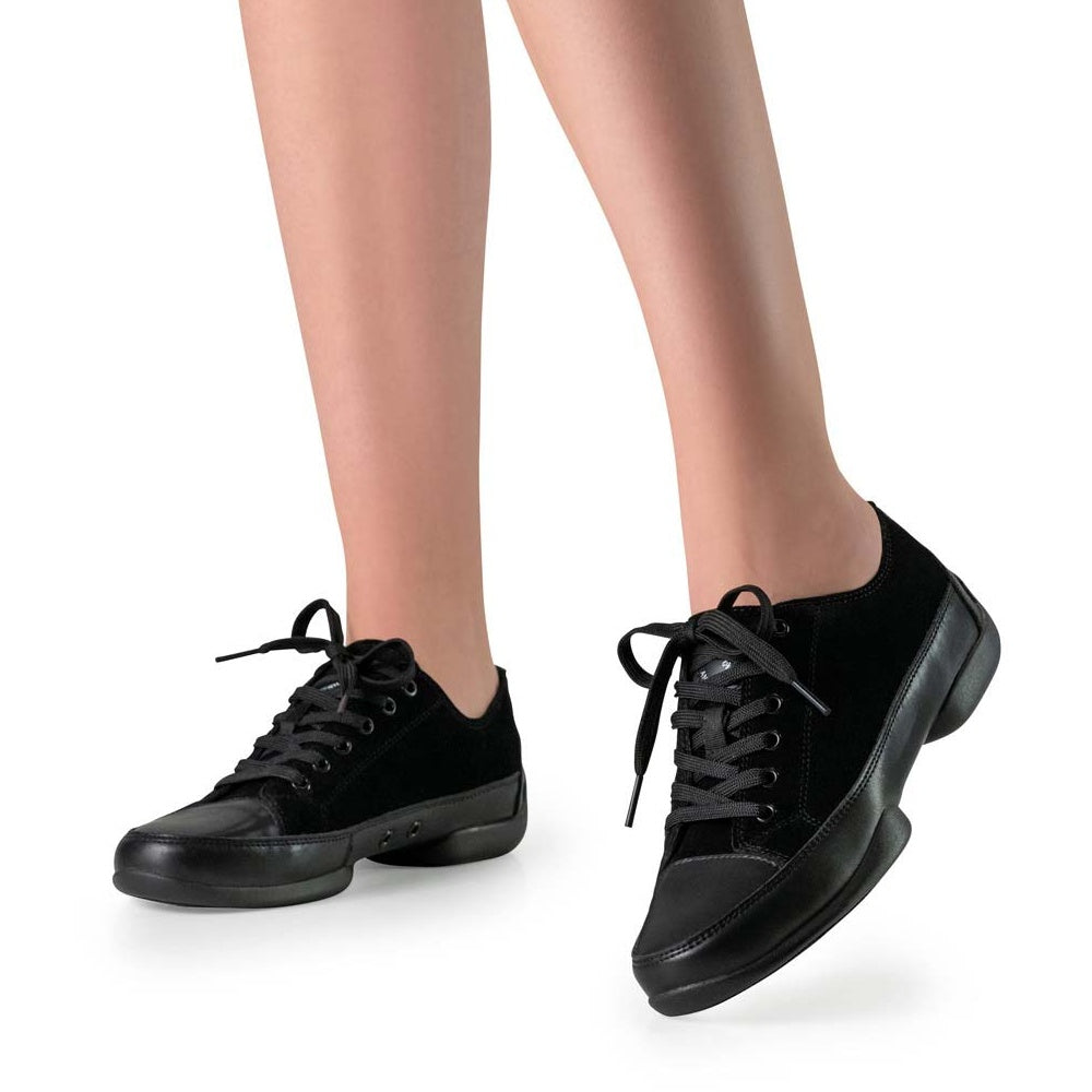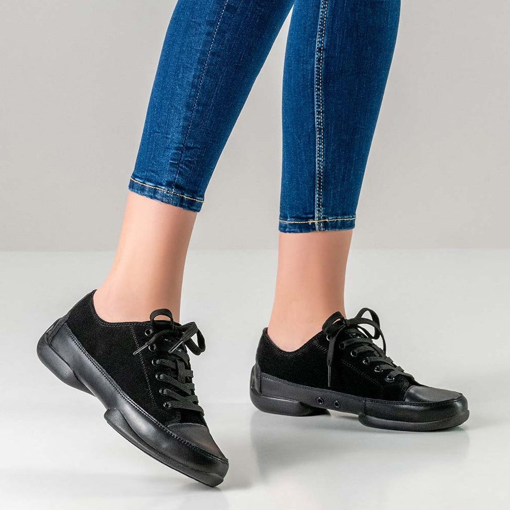 Taneční tenisky se semišovou podrážkou. Tenisky mají dělenou podrážku. Přední část podrážky má dokonale klouzavou semišovou podrážku. Navíc taneční tenisky zaujmou velmi dobrým tlumením. Díky své flexibilitě a tenké podrážce jsou ideální pro Zumbu, salsu, trénink a jazzový tanec.