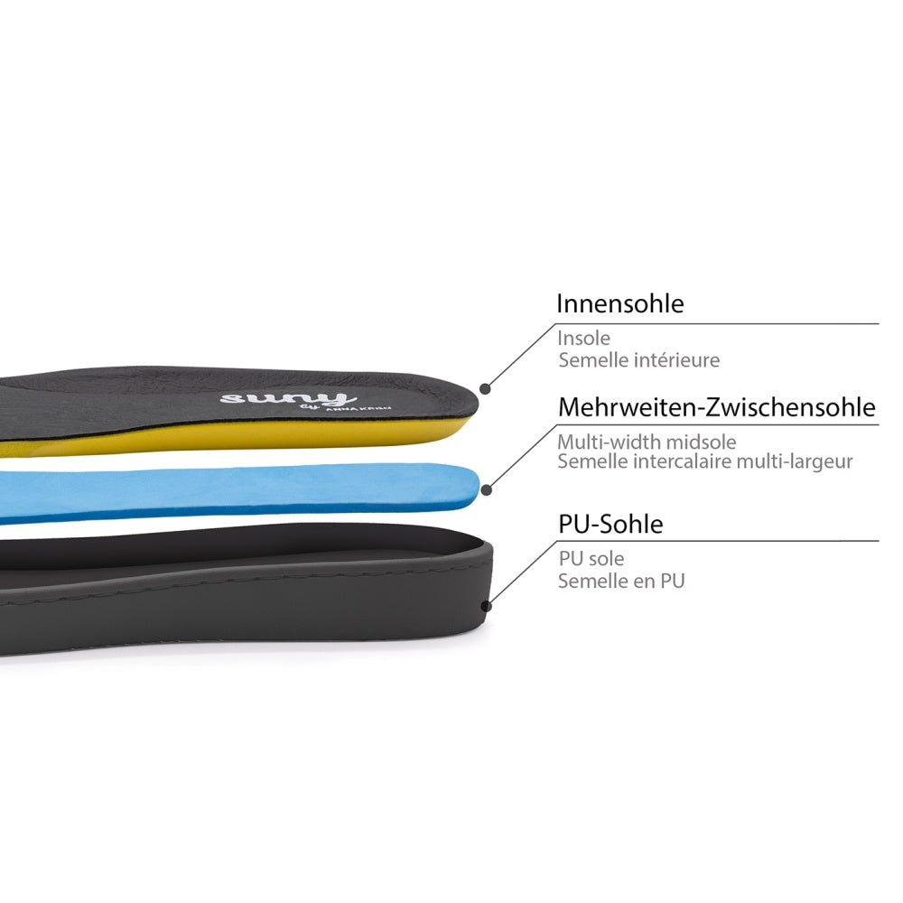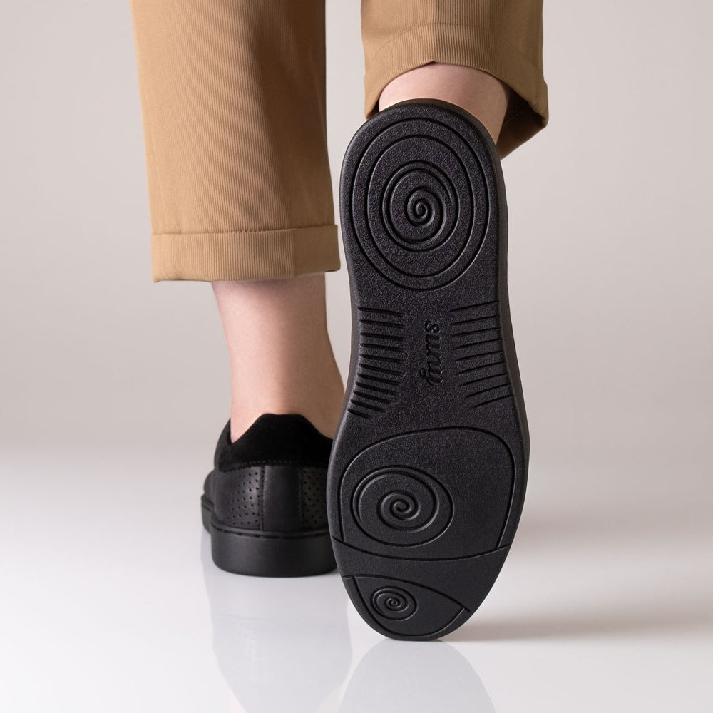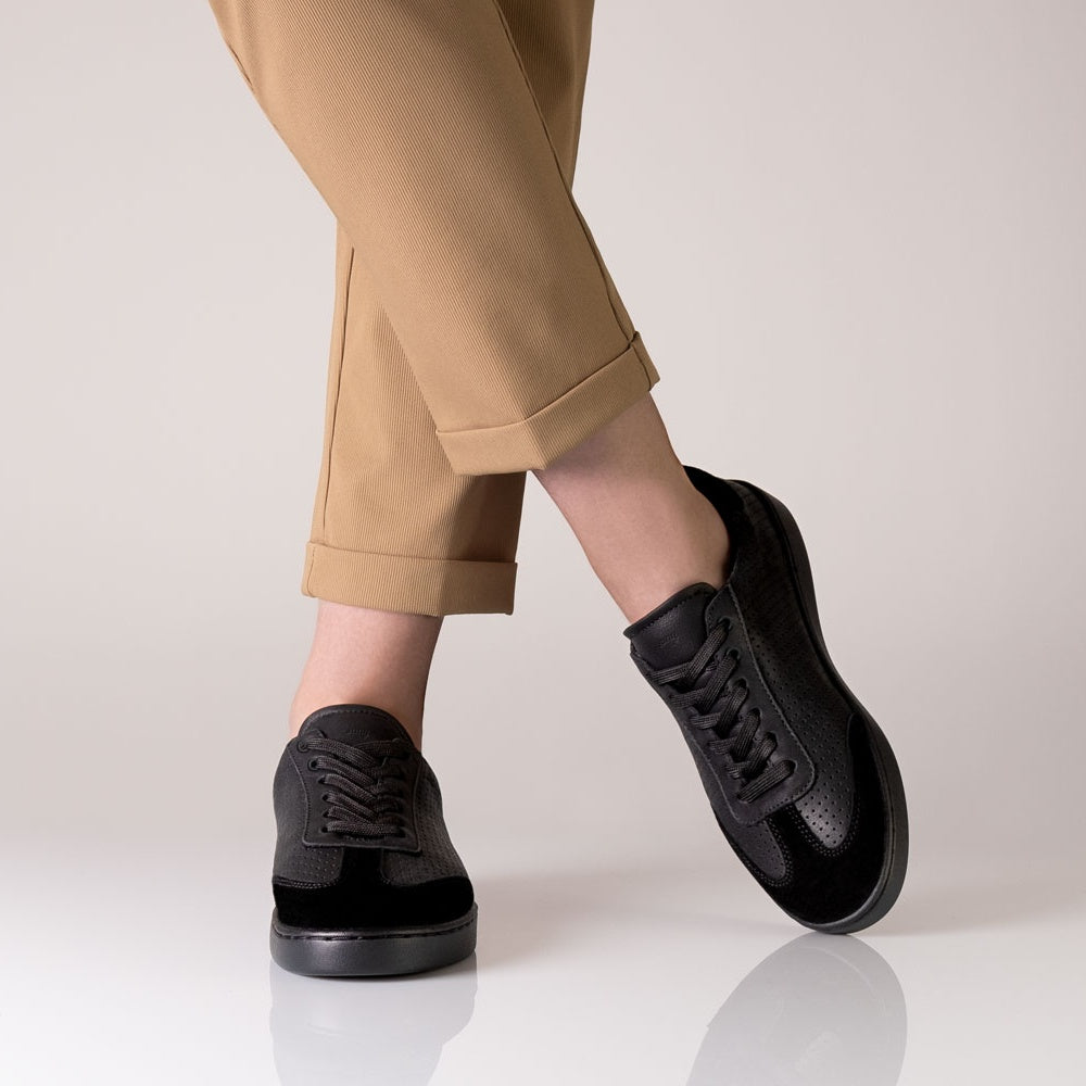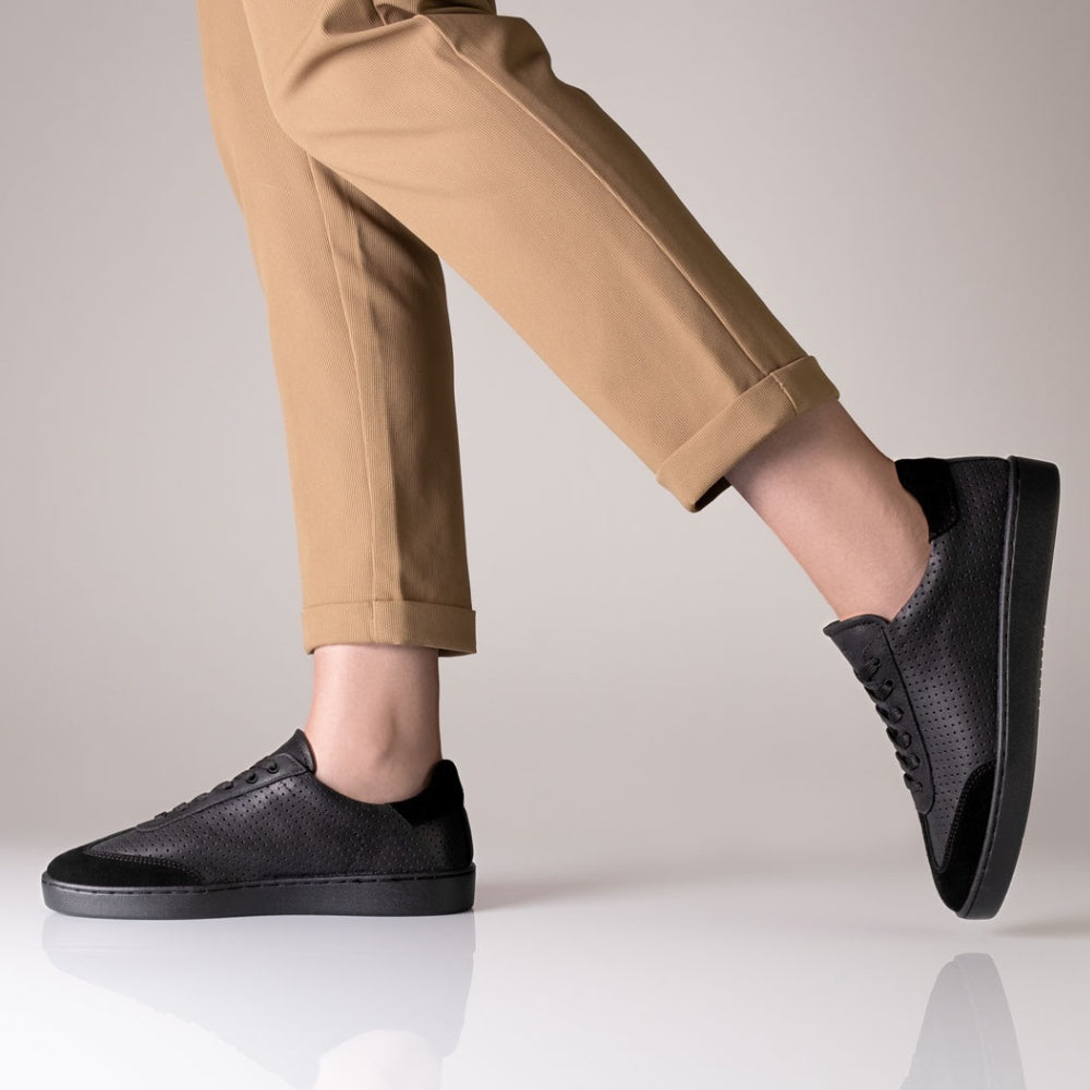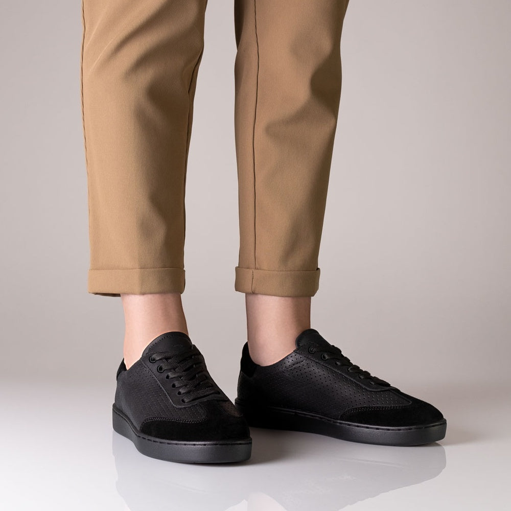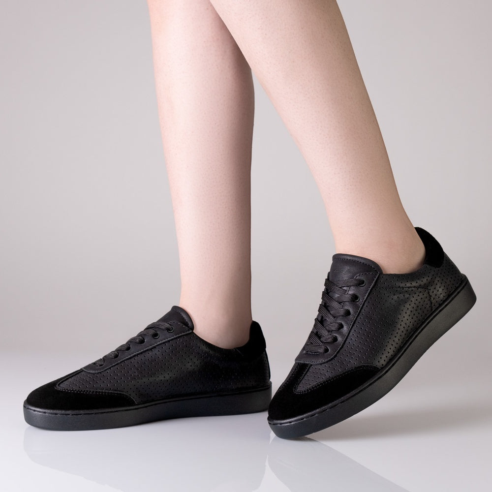 Tyto městské, lehké tenisky od Suny umožňují snadné a přesné otáčení na všech podlahách. Vyrobené z černé, perforované nappa kůže kombinované s jemným semišem, se tyto výjimečné tenisky dokonale přizpůsobují noze. Nově vyvinutá, kůží potažená a vyjímatelná stélka poskytuje vynikající oporu a tlumení s každým krokem. Se svým stylovým, celočerným designem jsou Suny 7030 nejen krásné, ale také perfektním společníkem pro jakýkoliv taneční večer - jak v interiéru, tak venku.
