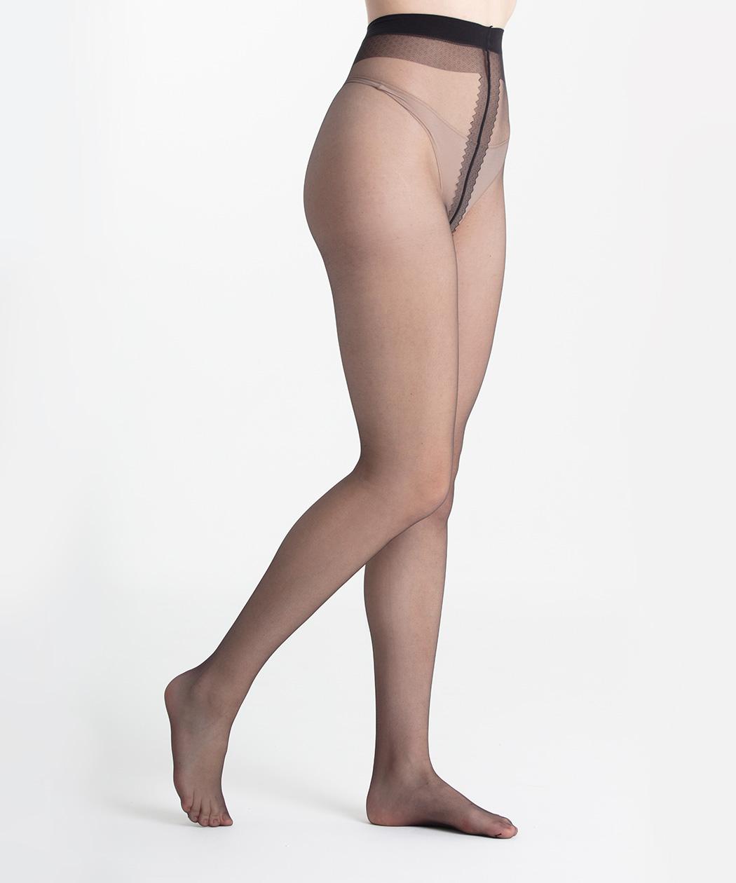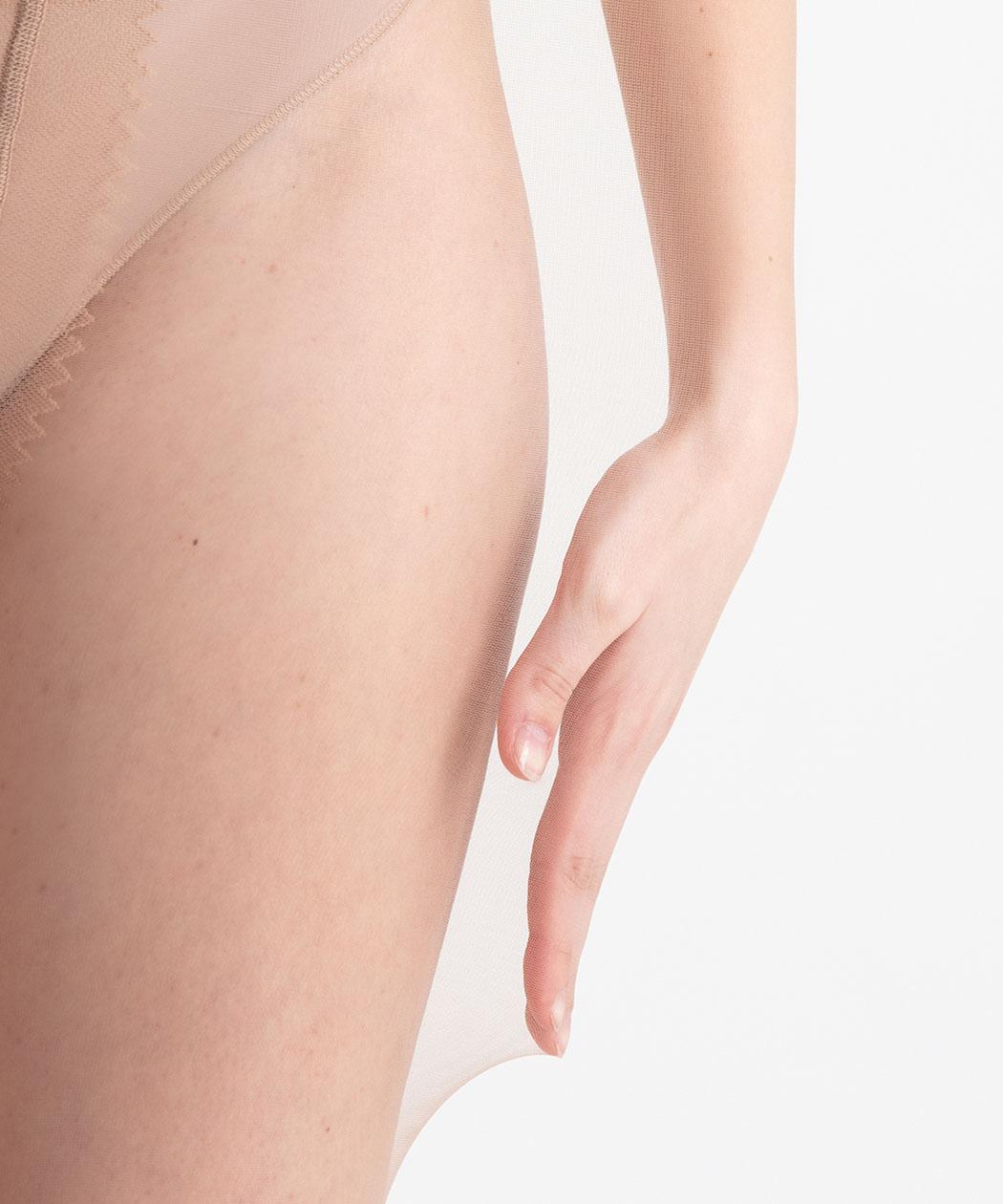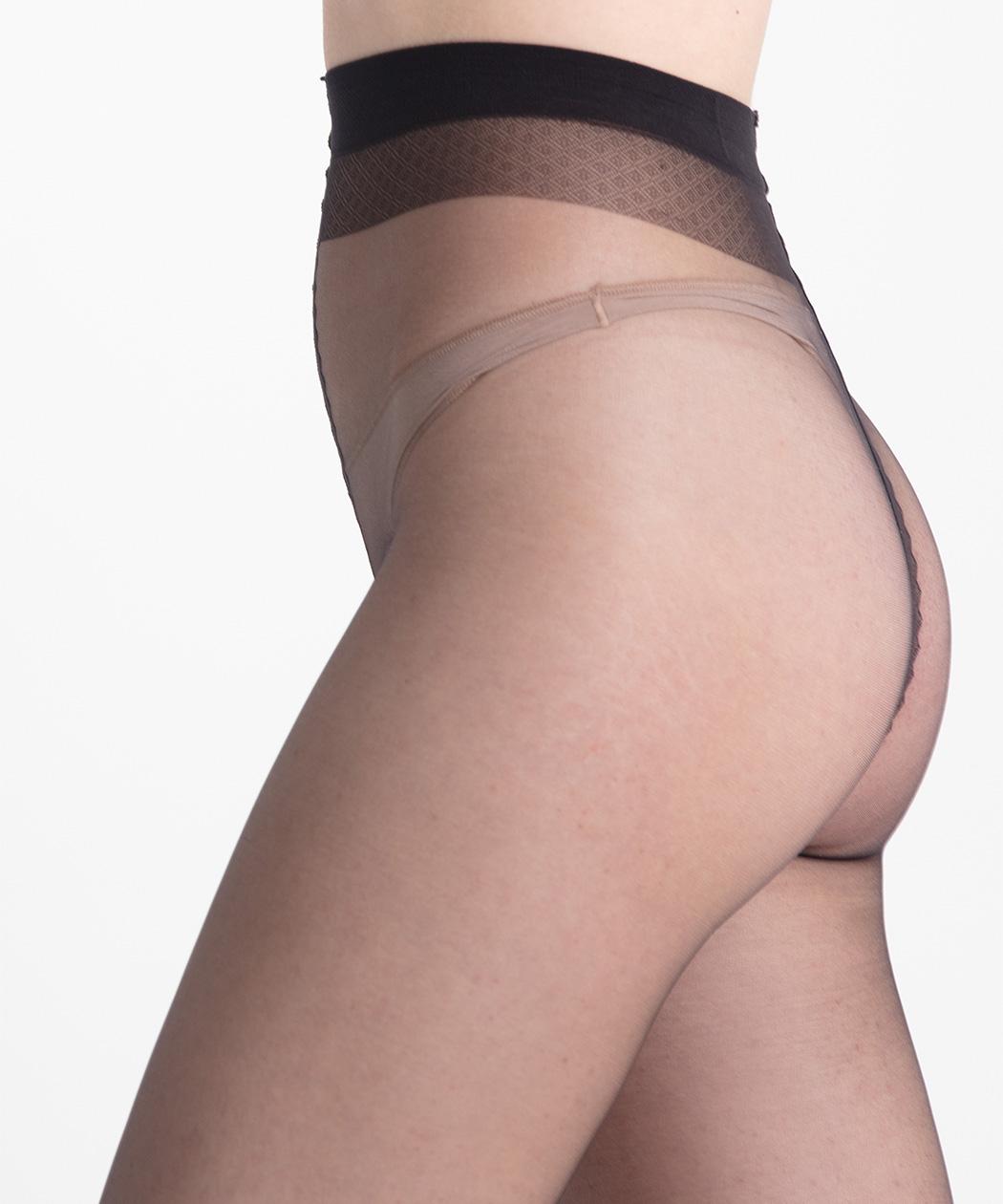 - Zesílená část kolem švů v kalhotkové části: Diskrétně zesílený prostřední šev ve stylu T-band zajišťuje funkčnost a podporu, aniž by narušoval jemnost a lehkost silonek.