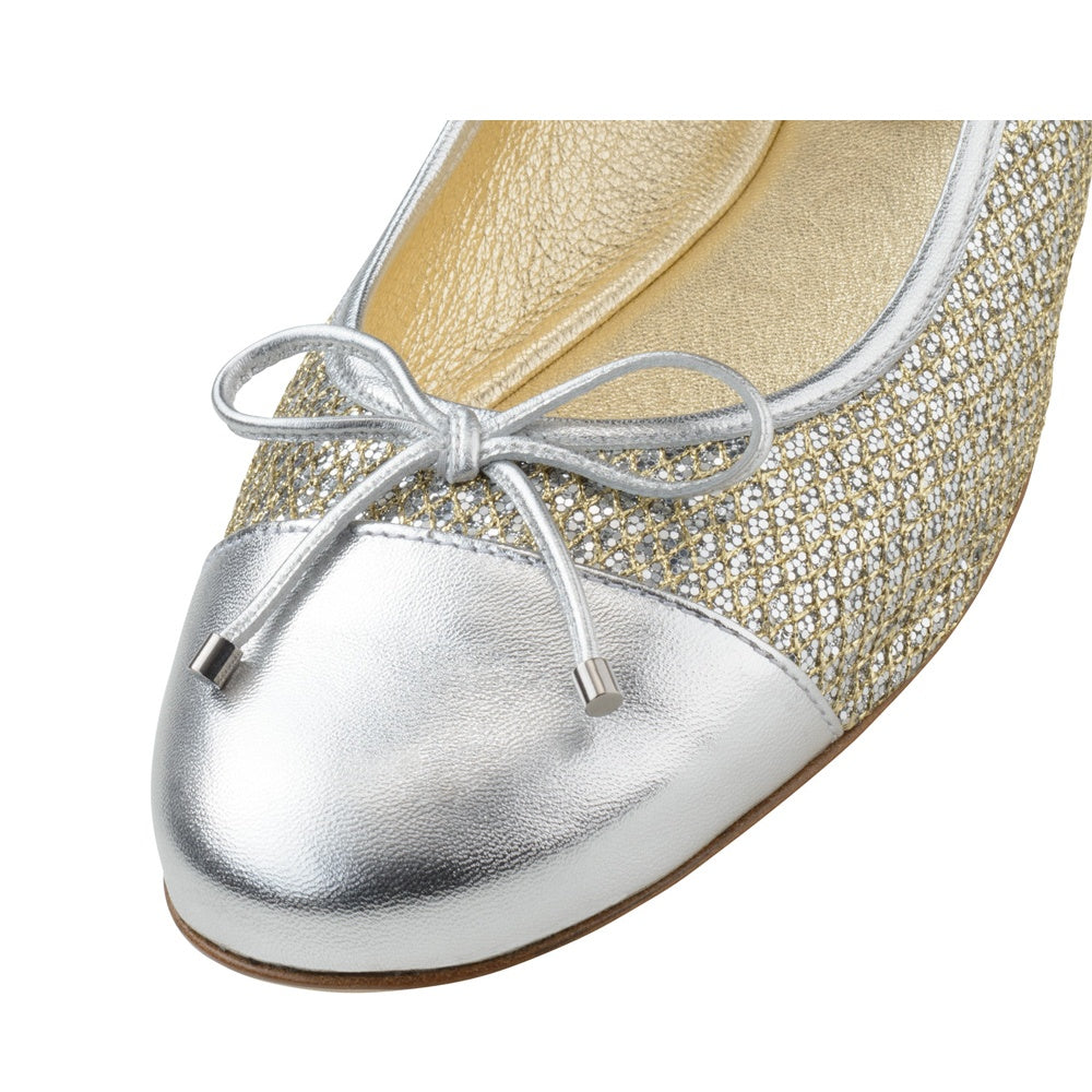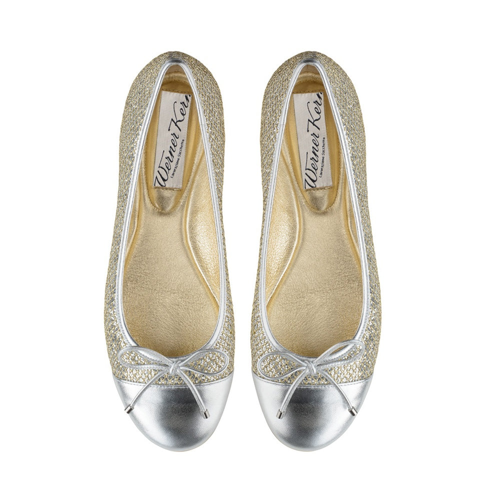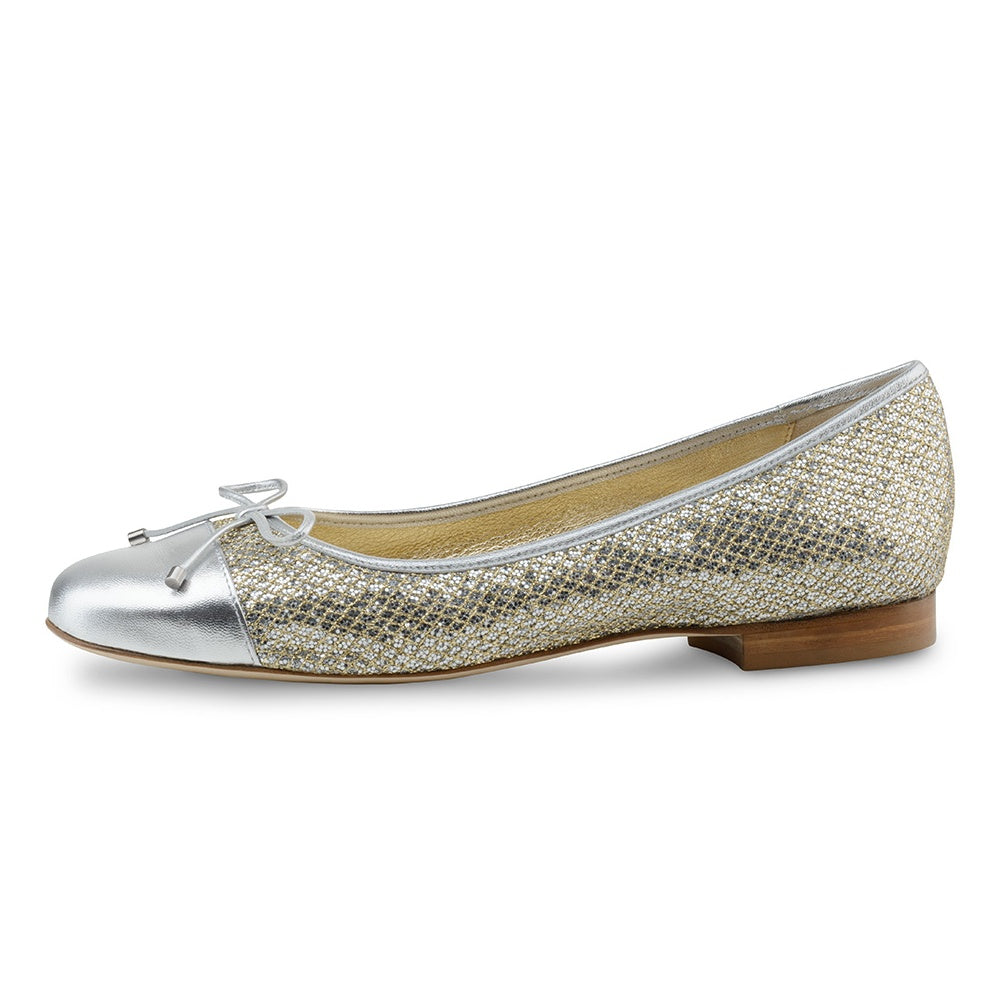Tyto baleríny nás inspirují v této sezóně svým velmi speciálním vzhledem. Kombinace měkké laminované nappa kůže ve stříbrné barvě a jemného anglického brokátu ve stříbrno/zlaté zaručuje brilantní vzhled. Odpovídající mašličková dekorace a jemné lemování dodávají modelu nesrovnatelný vzhled. Pár byl vyroben v malé továrně mezi olivovými háji a vinicemi v srdci Toskánska. Noste tyto boty s vašimi oblíbenými letními outfity.