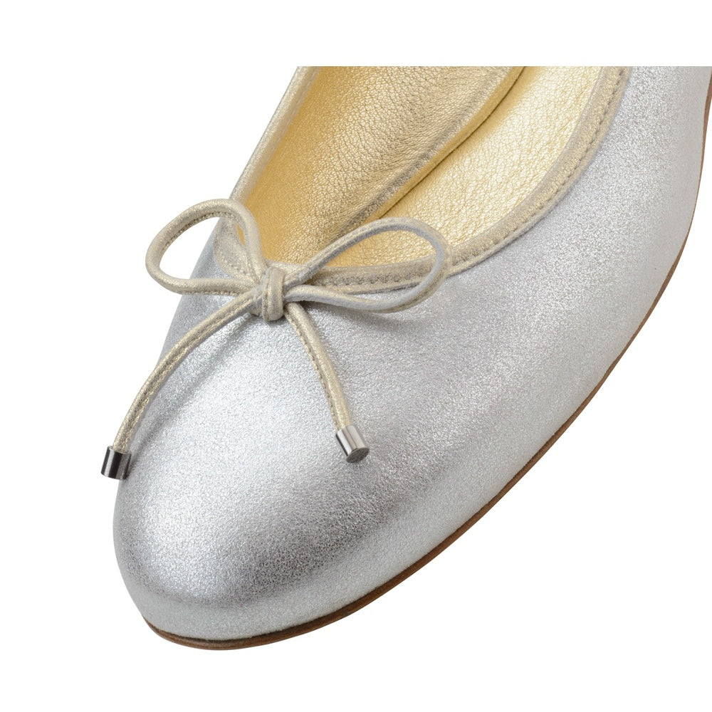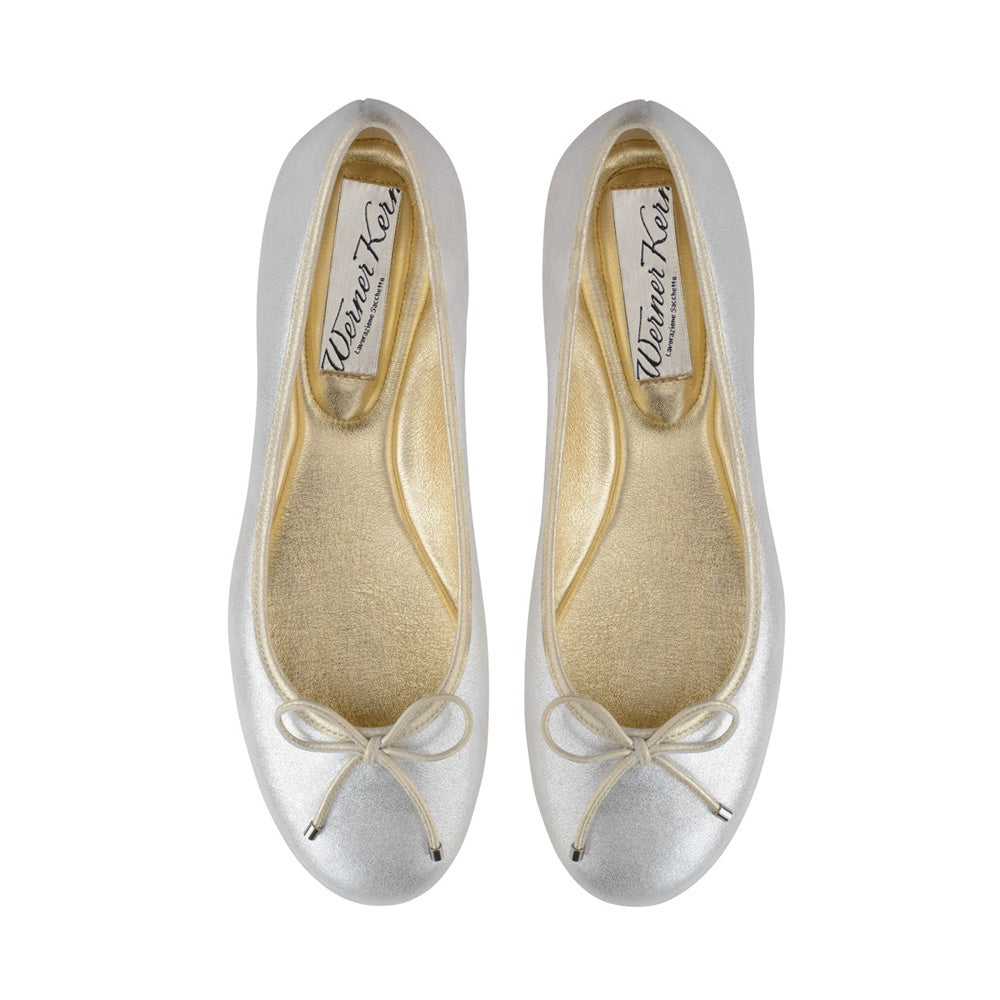 Tyto baleríny přicházejí v letních odstínech saténově metalické stříbrné a tělové barvy. Vyrobené nedaleko Florencie z rukavičkově měkké semišové kůže, tento pár se vyznačuje jemně barevným detailem mašličky a jemným lemováním pro oporu. Kovově zbarvení dělá z tohoto modelu nadčasového společníka i po skončení letní sezóny. Propracované a prodyšné zpracování sacchetto a rukavičkově měkká kozí podšívka zaručují maximální pohodlí během dlouhého letního dne.