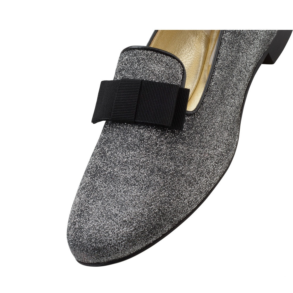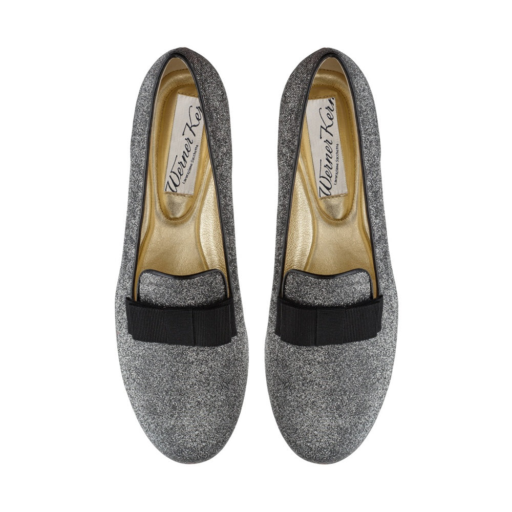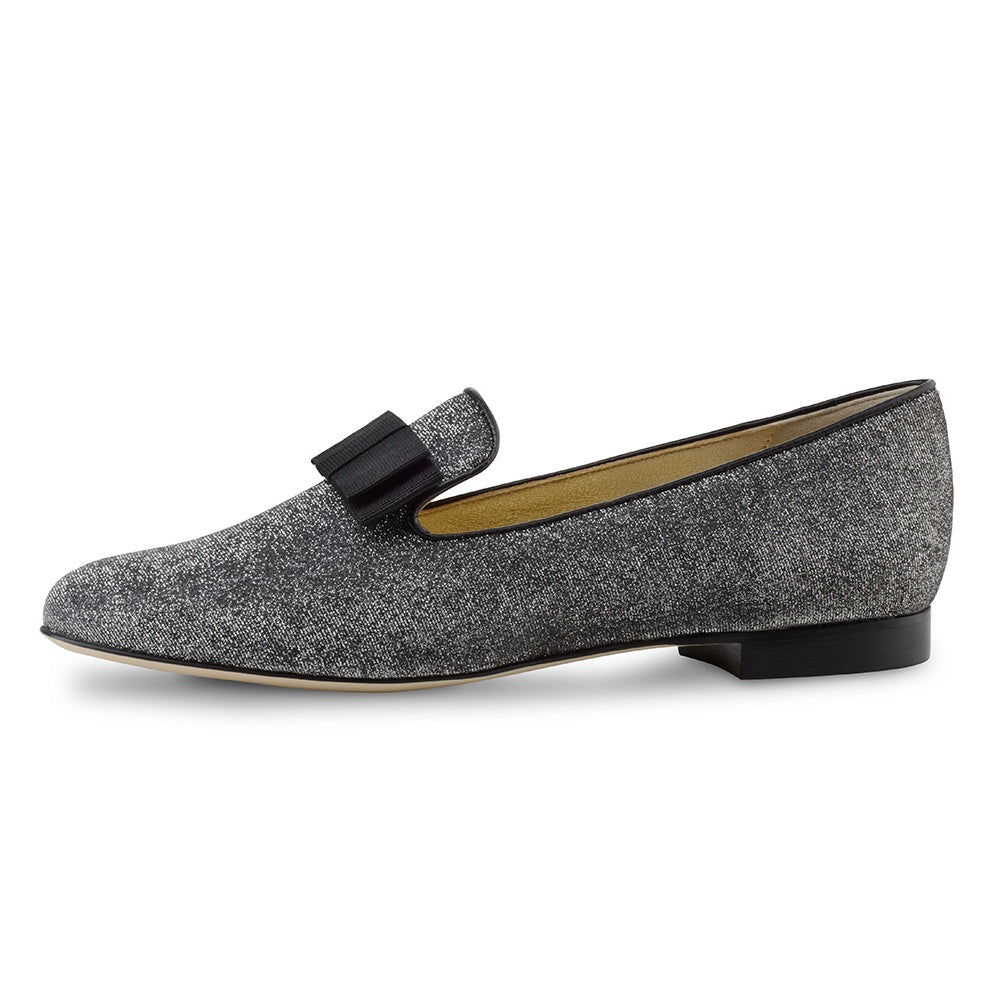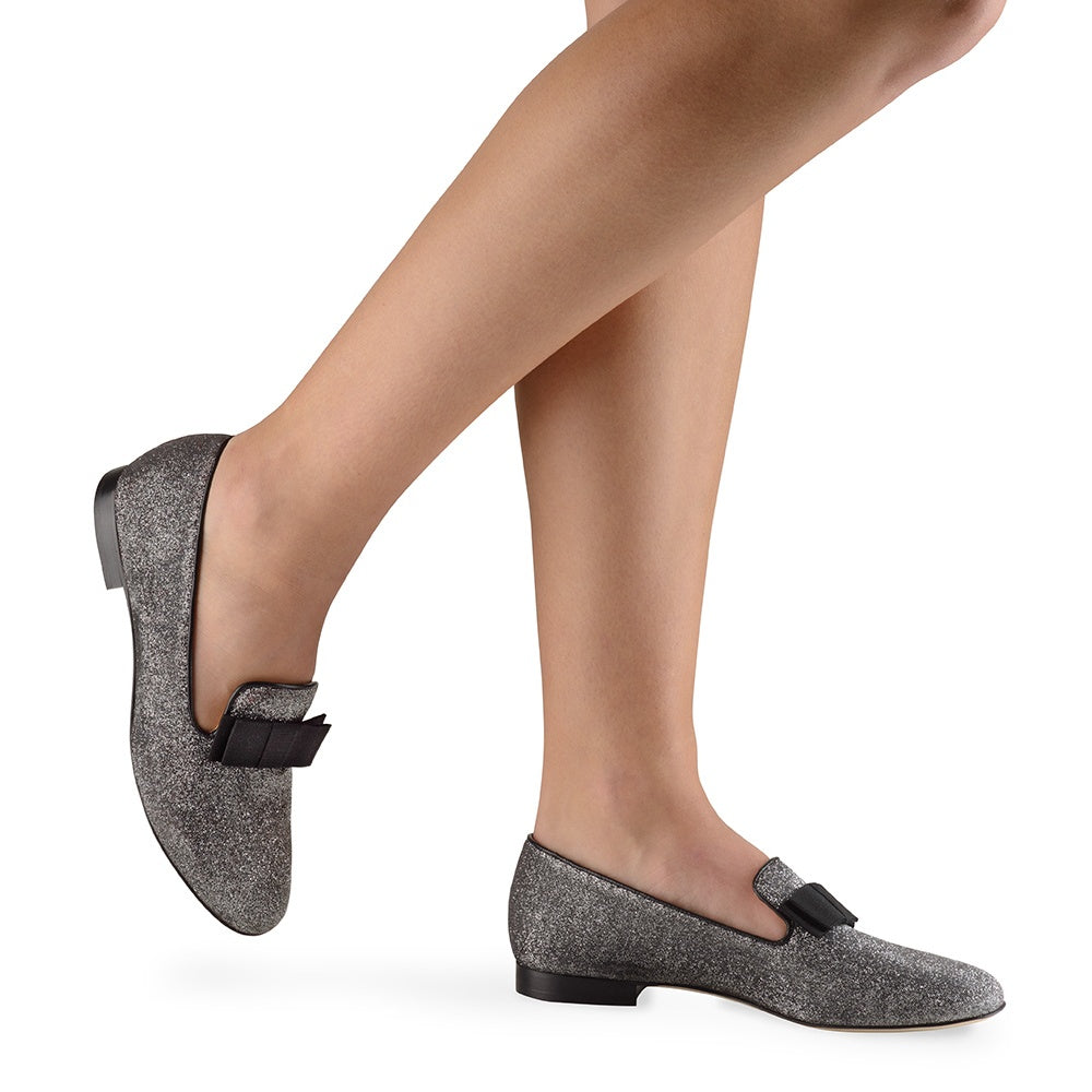 Tyto baleríny získávají svůj extravagantní charakter díky své typické siluetě v kombinaci s nejjemnějším anglickým brokátem v černé a stříbrné barvě. Plochý pár je dokonale doplněn jemným koženým lemováním a charakteristickou mokasínovou mašličkou. Pár byl vyroben v srdci Toskánska. Noste je během dne, abyste povýšili svůj vzhled, nebo večer s šaty místo lodiček.
