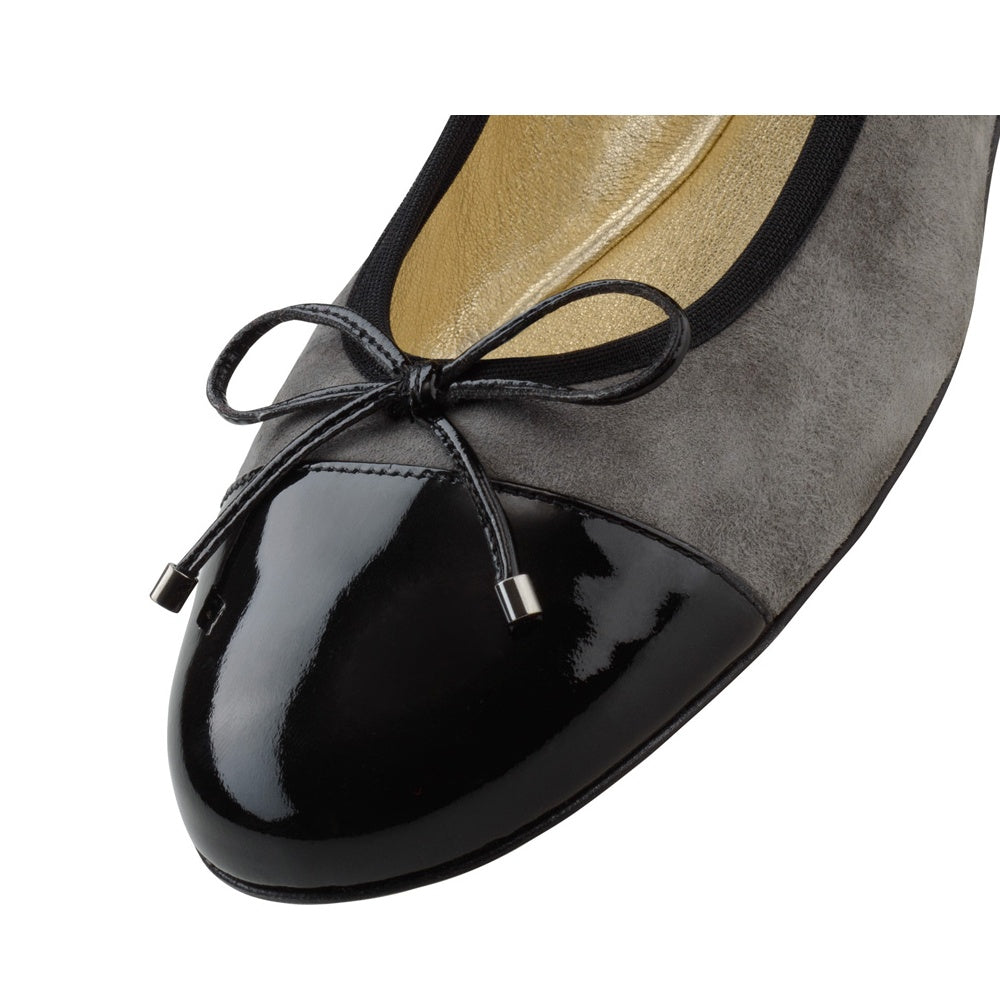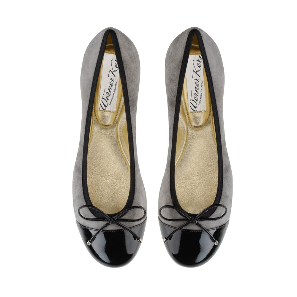 Tyto šedé baleríny vyrobené z jemné kozí semišové kůže kombinované s černou lakovanou kůží byly vytvořeny v malé továrně v srdci Toskánska a jsou pohodlné pro celodenní nošení díky plochému podpatku. Zaoblená špička a odpovídající mašlička dokonale doplňují tento pár. Elastické lemování a polstrovaná kožená stélka zaručují perfektní padnutí a maximální pohodlí.