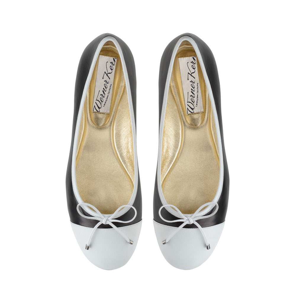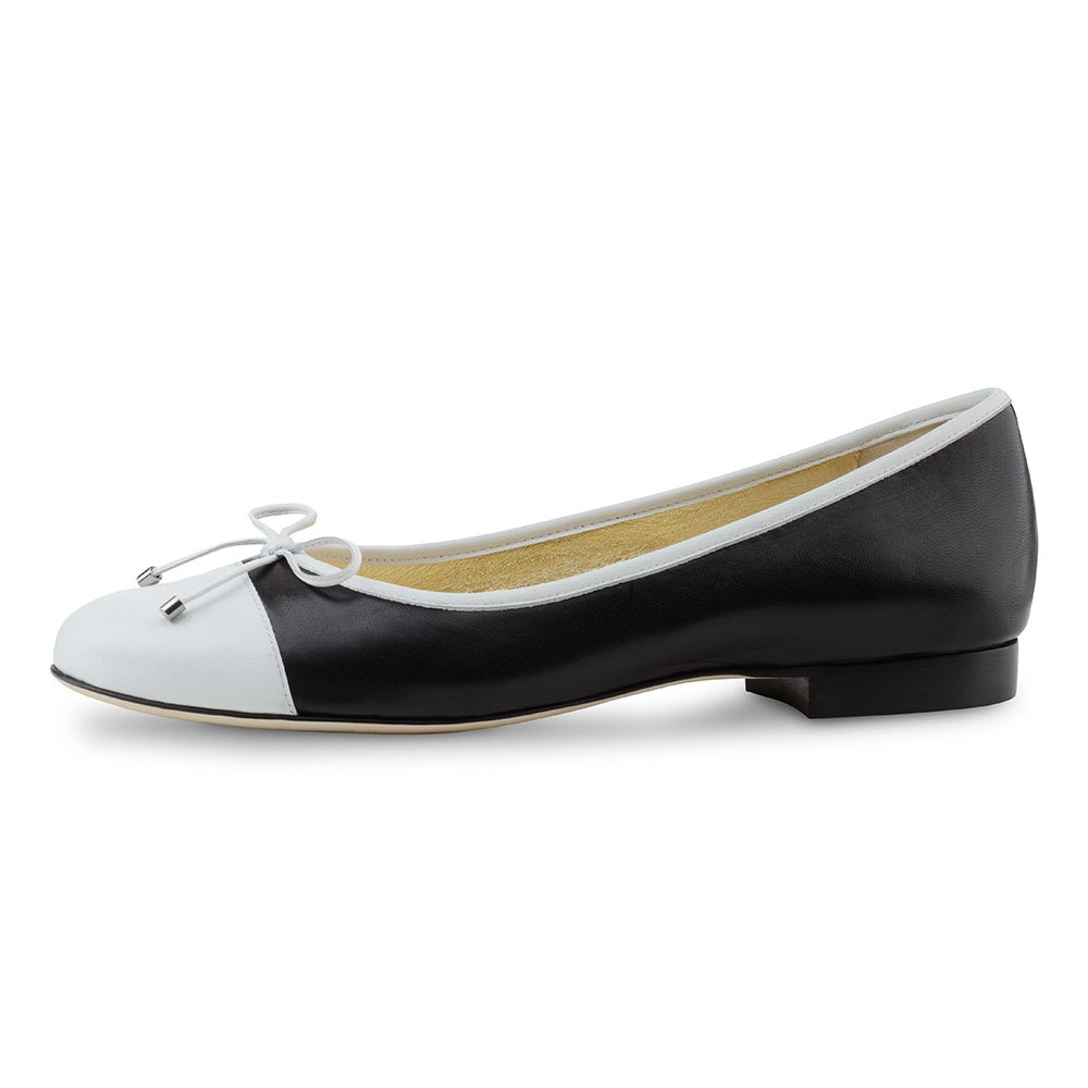 Tyto bílo-černé baleríny byly vyrobeny v Itálii z máslově měkké nappa kůže a dostaly minimalistickou a nadčasovou siluetu, což činí z tohoto páru moderního favorita, který vydrží i po skončení této sezóny. Díky plochému podpatku a řemeslnému zpracování sacchetto lze tento pár nosit celý den - ať už v kanceláři nebo po práci.