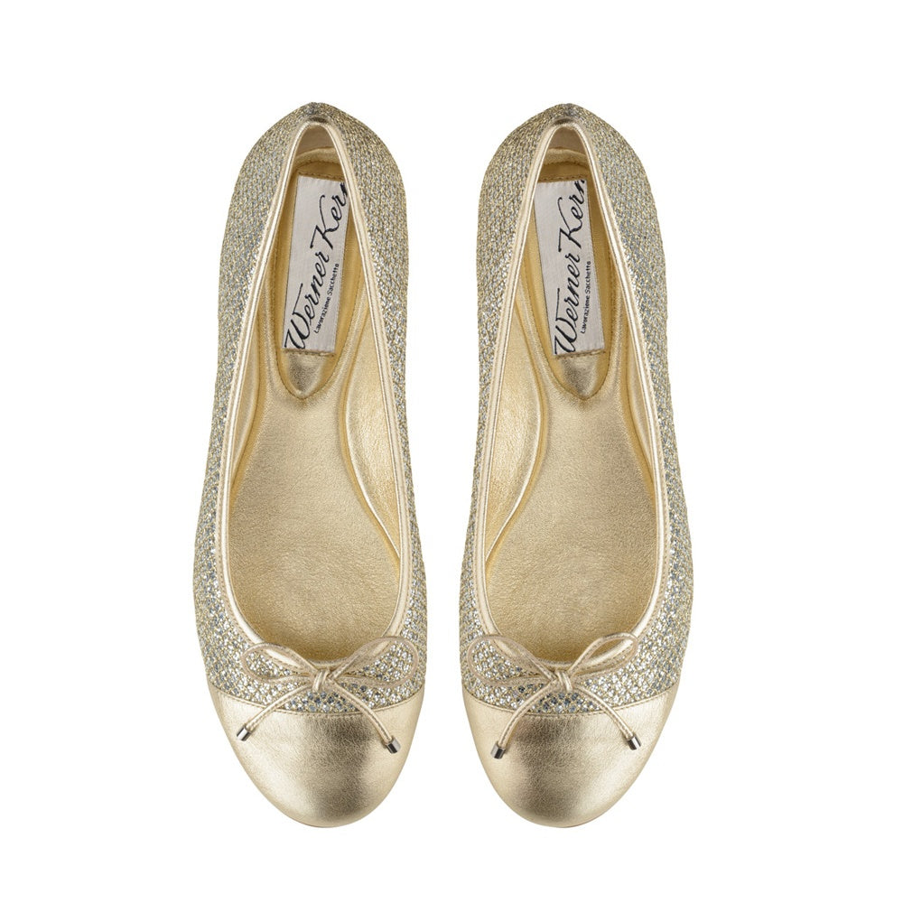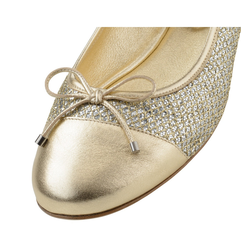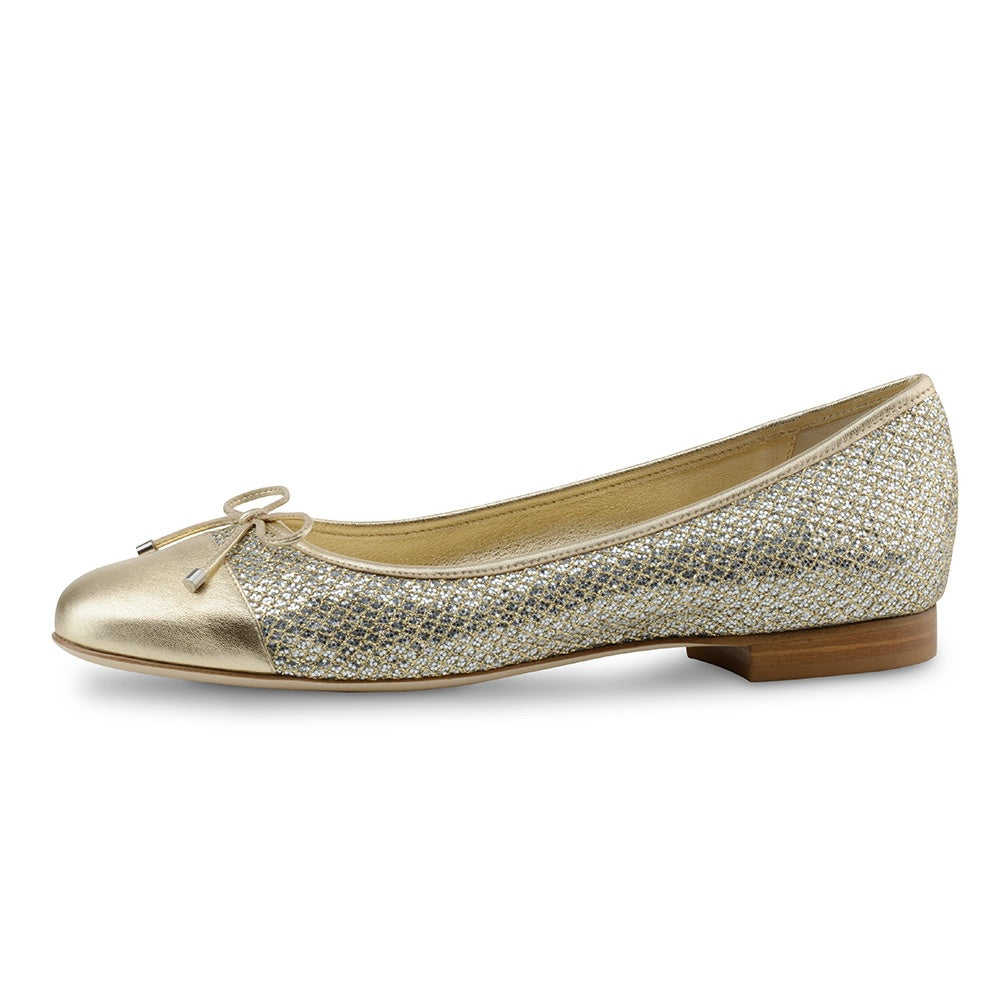 Tyto baleríny nás inspirují v této sezóně velmi speciální kombinací jemné italské laminované nappa kůže a anglického brokátu. Barevné schéma jemného zlata a nádech stříbra dělají z tohoto modelu vašeho elegantního společníka. Lehce kontrastní kulatá špička a jemné lemování kolem okraje dodávají páru nesrovnatelný vzhled. Propracované zpracování sacchetto a rukavičkově měkká kozí kožená podšívka zaručují maximální pohodlí po celý den. Noste tyto boty s vašimi oblíbenými outfity.